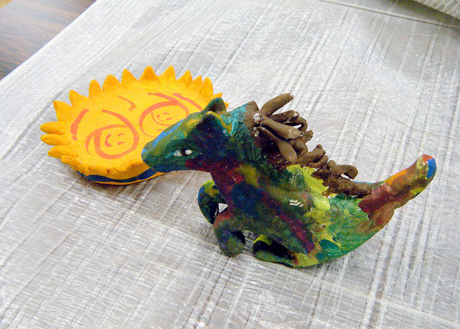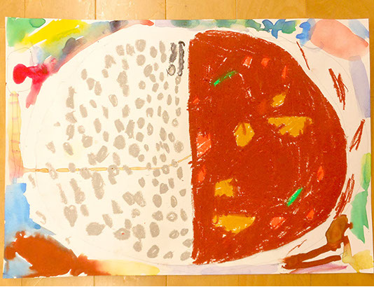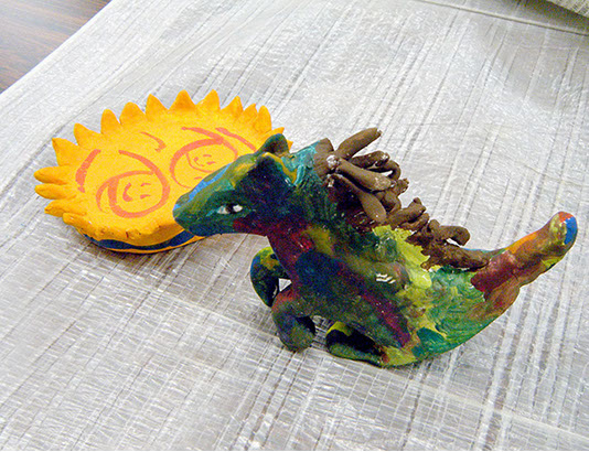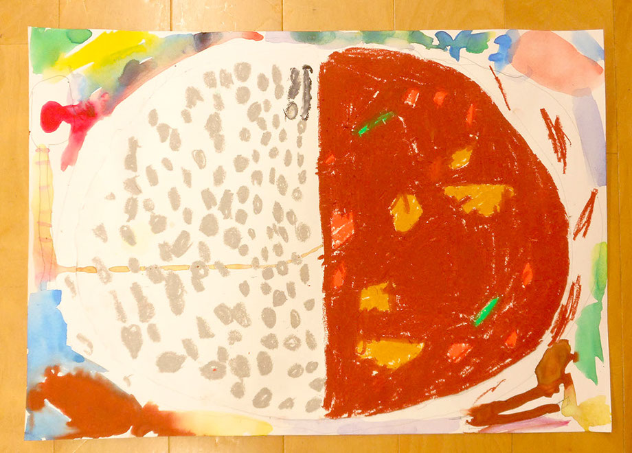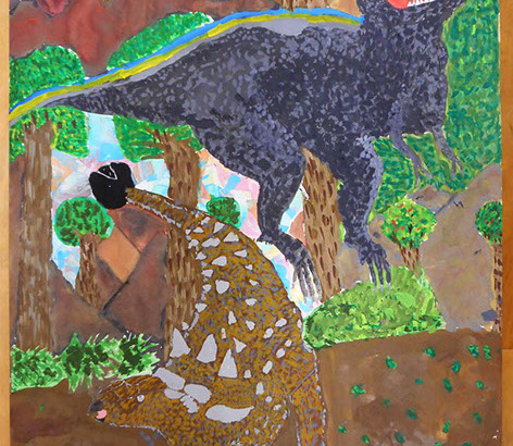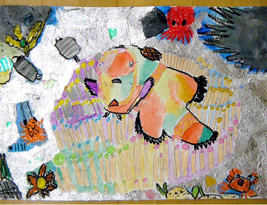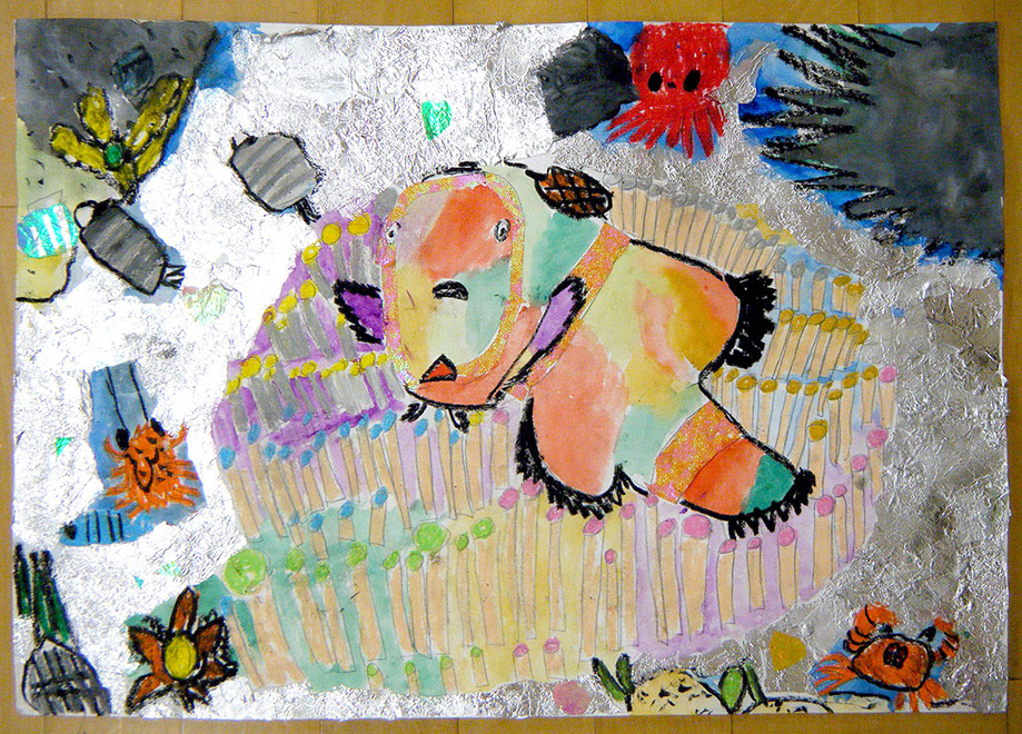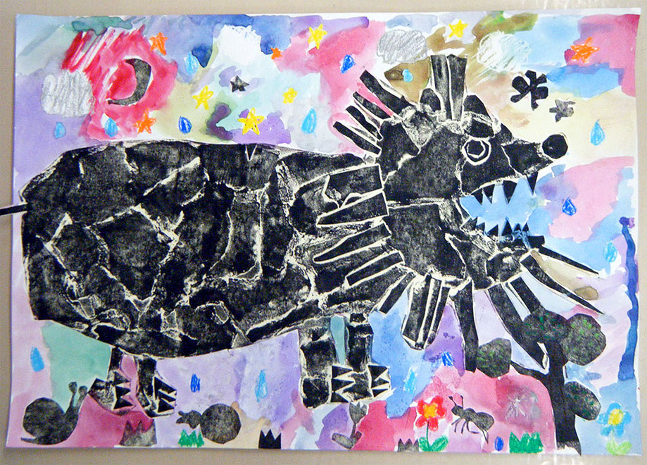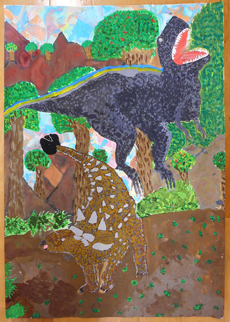”マーブリングの不思議な世界” マーブリングでできた模様から発想を広げ、古代の恐竜世界を現しました。細部まで描きこまれていて、迫力満点です。