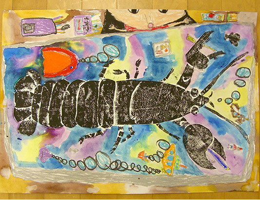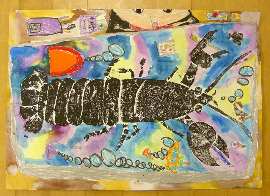 ”版画_ザリガニ” 家に飼っているザリガニの様子を版画にしたね。自然な一場面を現しているところもとてもステキだね。