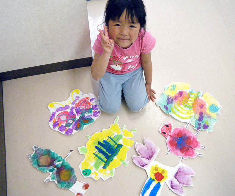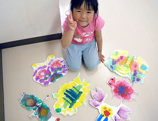 “デカルコマニー_なにがみえる?” 紙をくるくる動かして・・なにが見えてくるのかな?カメがいたり、チョウチョがいたり・・いろいろな形を発見!