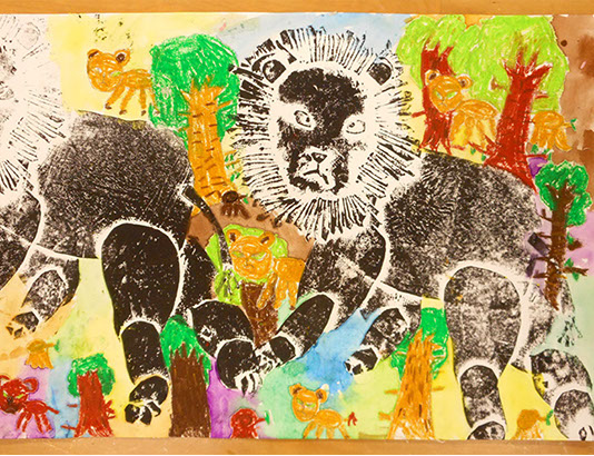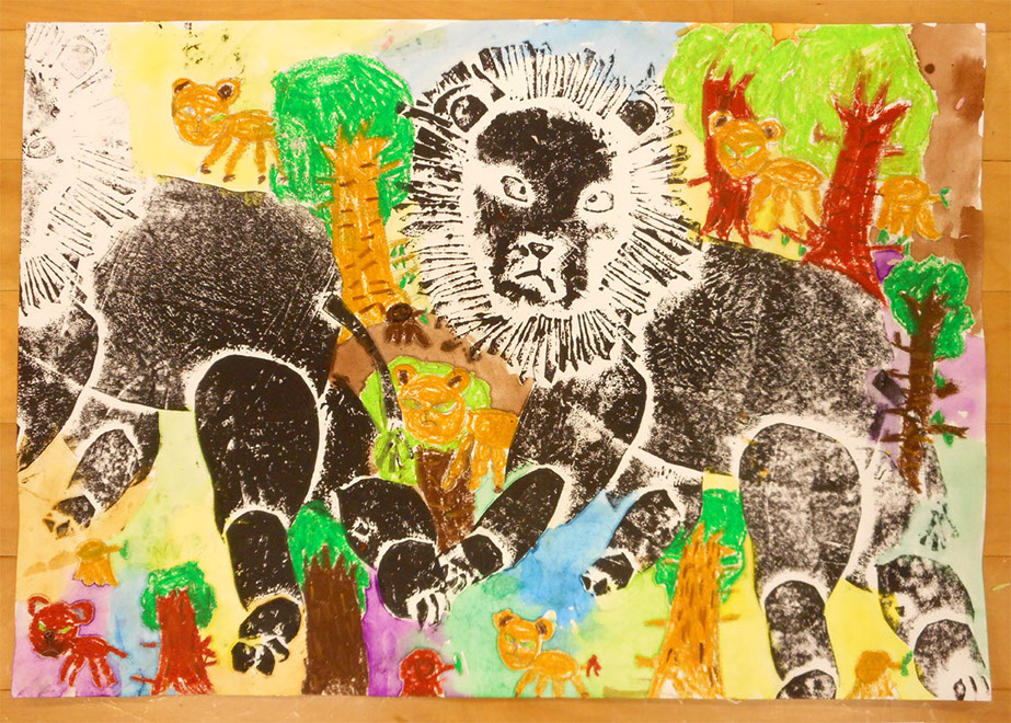 ”版画_ライオン” ライオンの紙版画を繰り返し使い、群れで移動しているようなおもしろい場面を現したね。
