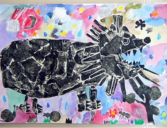 ”版画_ライオン” 紙をちぎって重ねながら顔の表情など、細かな部分まで現されています。白黒のシルエットがカラフルな背景と対比して、雰囲気が独特でステキです。