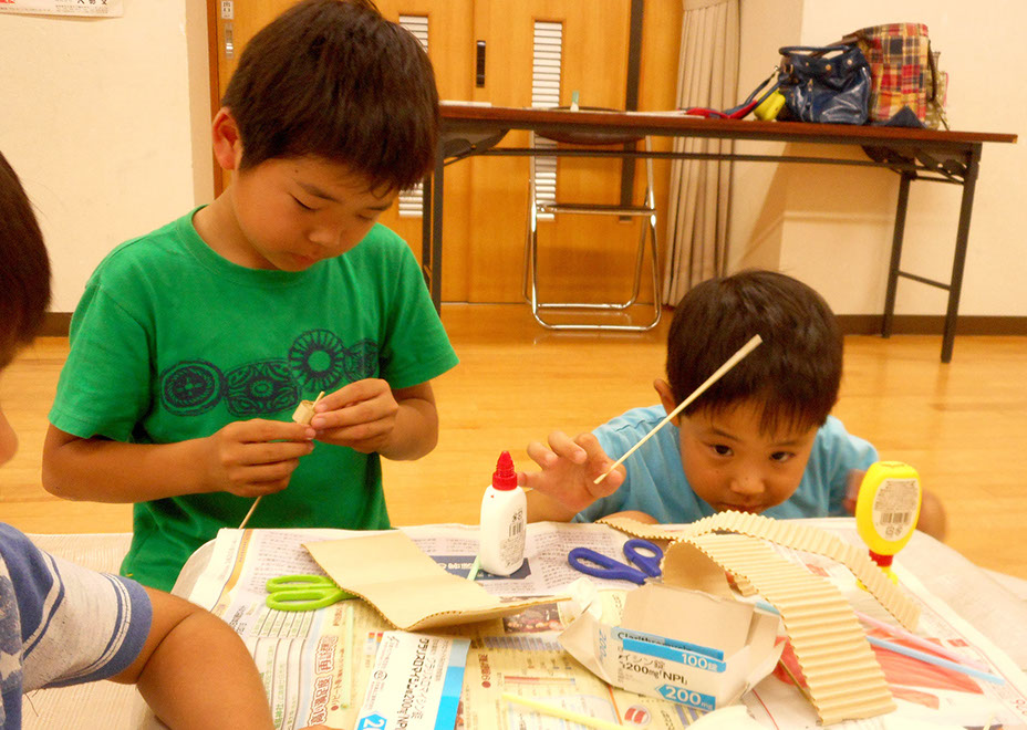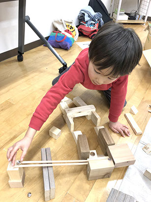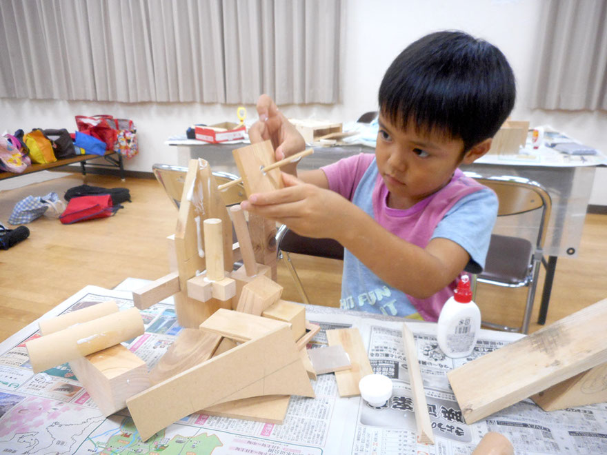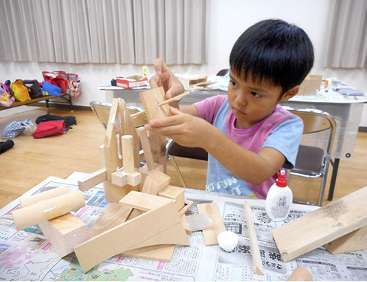 いろいろな形の木片を組み合わせ、なにを造ろうかな??
