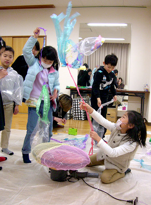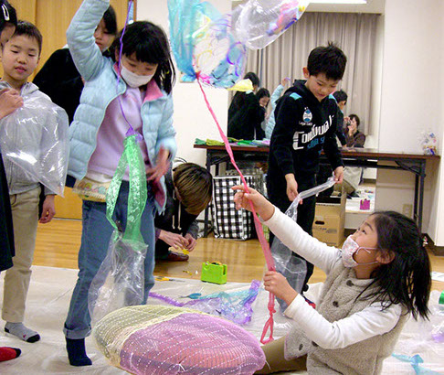 ”ふわふわの世界” 今度はどんなふわふわさんにしよう? 中に紙をいれたらきれいかな?しっぽをつけたらどうなるかな? 風に舞っておもしろい!