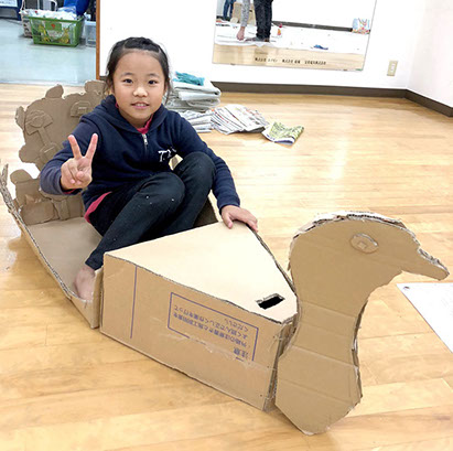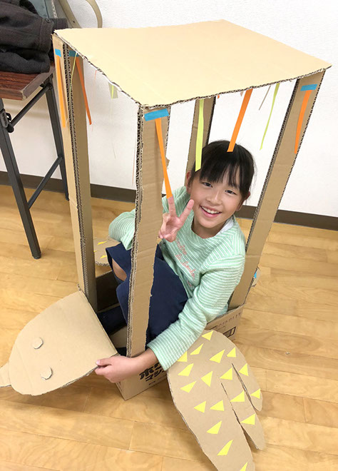 クジャク型の、”のりもの”をつくりました。体の荷物入れや、羽でできたイスなど、アイデアがいっぱいです。