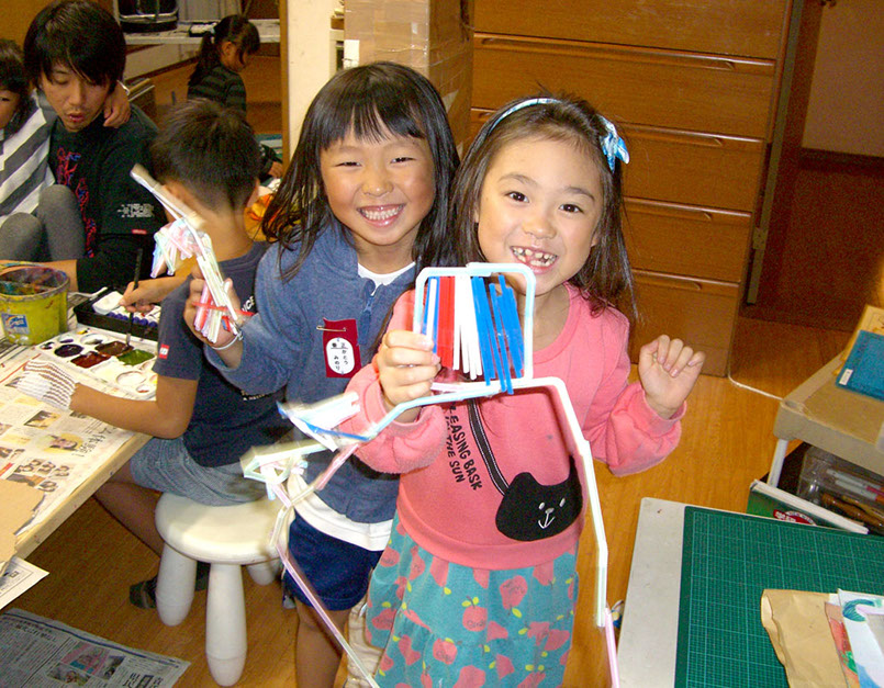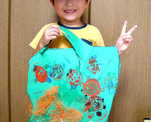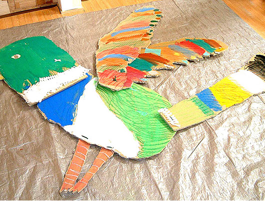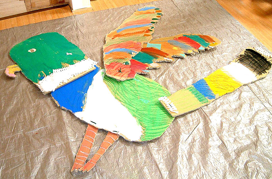 「大きな鳥」 羽のもようがカラフルなうごく大きな鳥をつくったね。