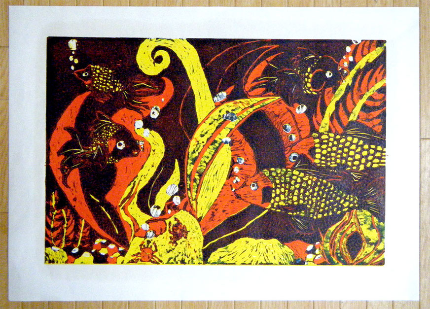 「彫り進み木版」 3色で版分けをし彫り進めていきました。彫りの細かさ見事です。水の中の世界が大変美しいです。