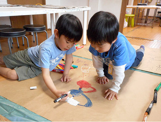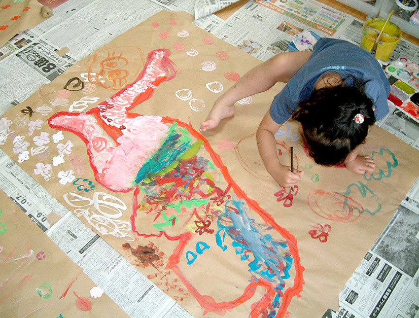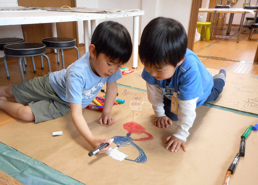「大きなかみにのびのびあ〜と」 ”まんなかには火山があって・・”お話をしながらどんどんイメージをふくらませ描いていたね^^
