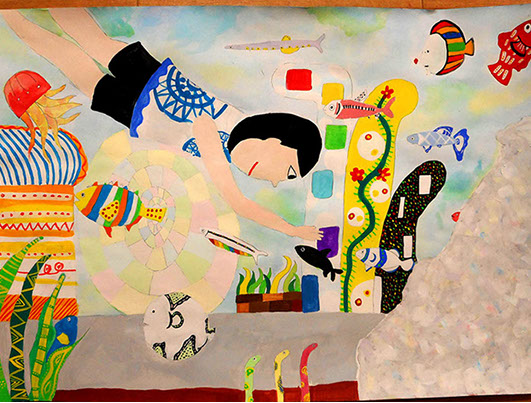 「じゆう画」 どんどんイメージを広げながら描いていきました。物語の一場面を見ているような大変ユニークな作品です。