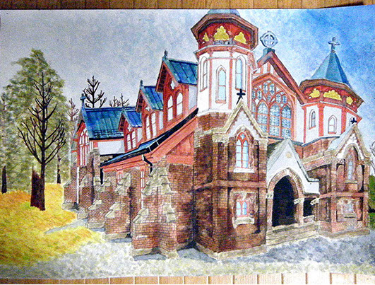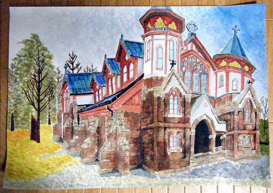 「写生_修道院」 遠近感を考え、レンガなど質感などもこだわりをもち一つ一つ丁寧に描かれた力作です。