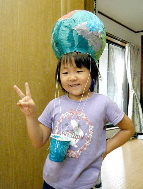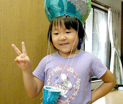 「はりこ_気球」 すいかのような模様をした気球を頭にのせて・・おもしろい!